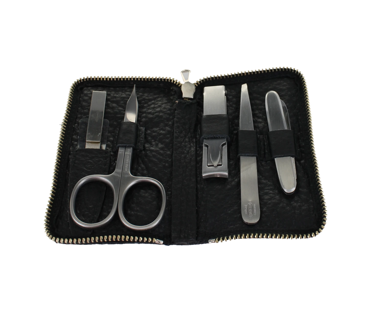 This 5 piece manicure set comes in a delightful black leather zippable case. This set includes tweezers, nail file, pen knife, nail clippers, and nail scissors.