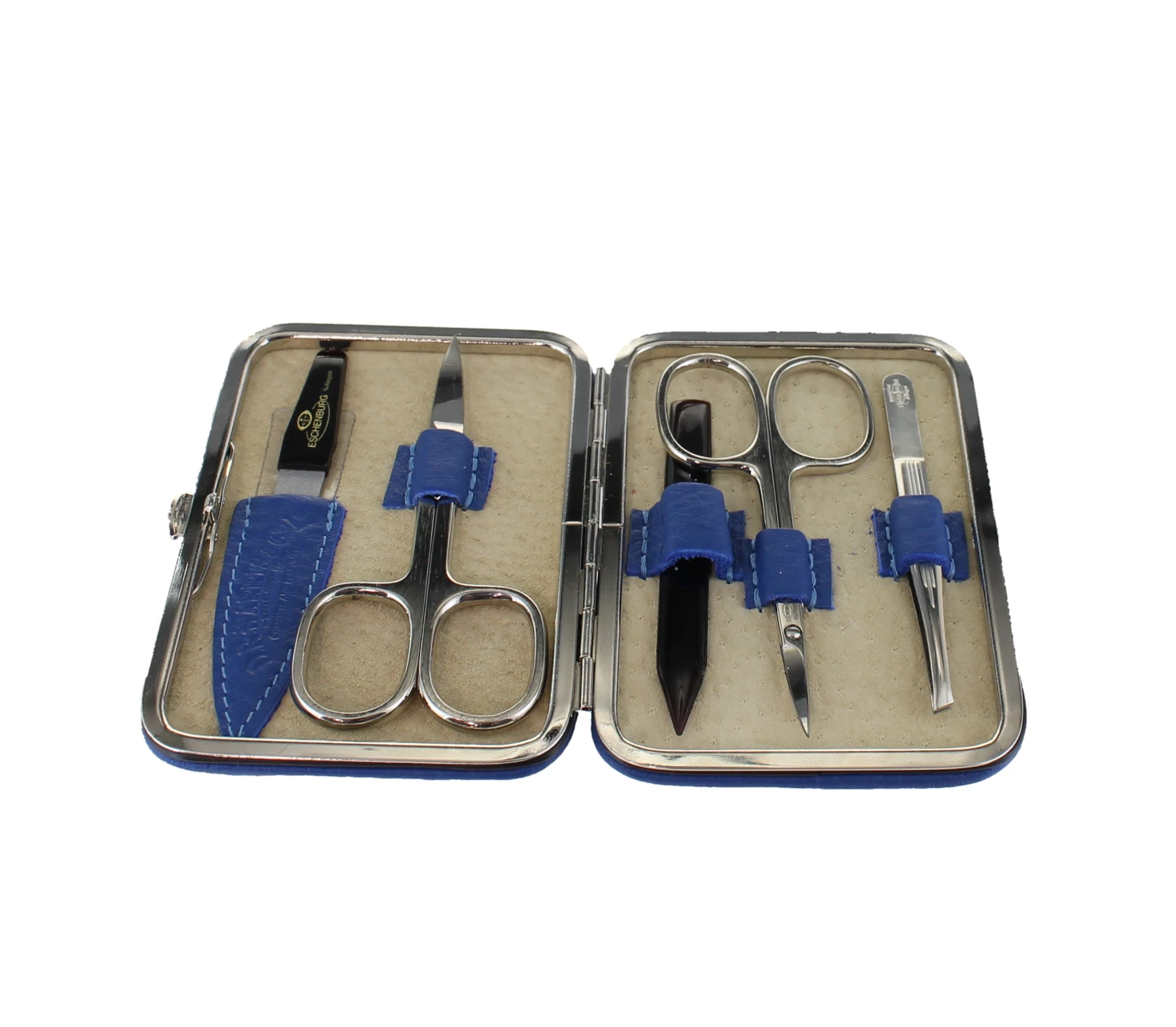 This 5 piece manicure set comes in a delightful blue leather hard case. This set includes tweezers, nail file, cuticle scissors, cuticle pusher, and nail scissors.