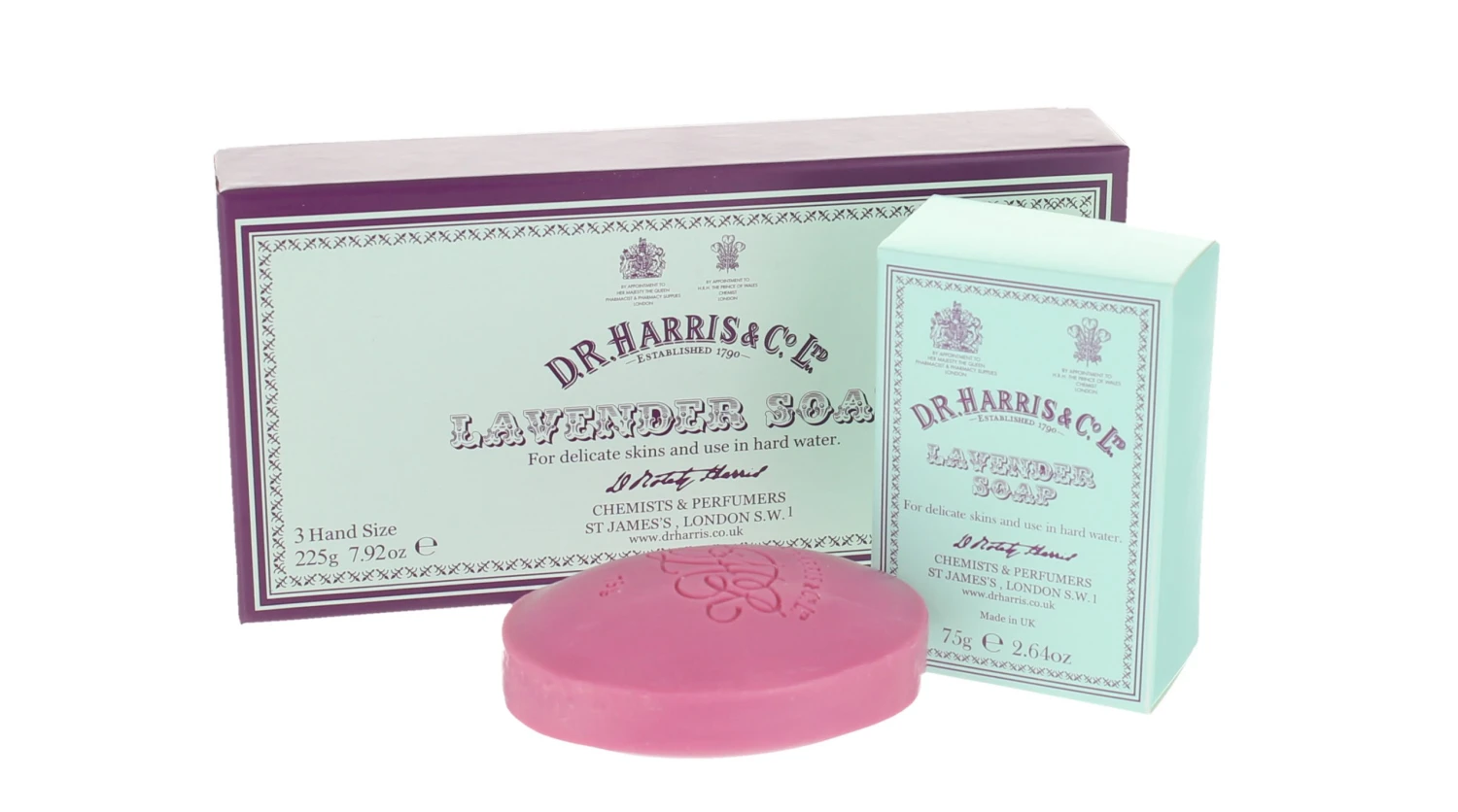The same superfatted formula of the D. R. Harris Almond Oil soap, but with the addition of our traditional D. R. Harris Old English Lavender scent and hue. A floral and herbaceous fragrance, available either in a box of 3 x 75g hand-size or a box of 3 x 150g bath size.